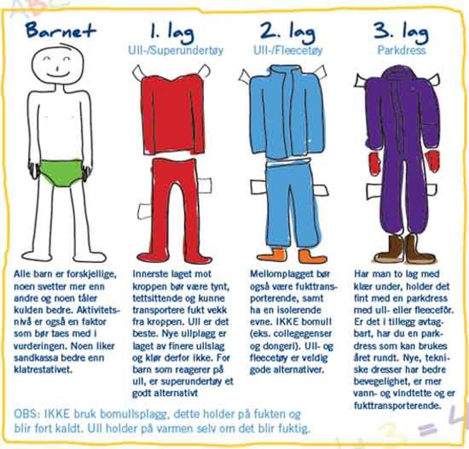 Todelt: Det er lurt å tenkje todelt, noko som gjer det enklare for barn å regulere temperatur ved å ta av og på plagg. Vidare er det enklare å gå på do og byte bleier når me er i skogen. Tenk på at i regnet må me kanskje ta av alle kleda for å bytte ei bleie eller gå på do? Todelte plagg gjer dette enkelt og meir behageleg ;)